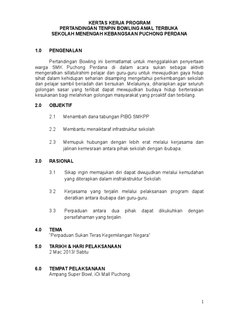 KERTAS KERJA PERTANDINGAN TENPIN BOLING 2016 PROGRAM PENDIDIKAN KHAS INTEGRASI SMK SERI INTAN KLUANG PENGENALAN Pertandingan bowling dalam Program. Kertas kerja program jom bowling di pacific bowling lot 217 tingkat 2 kb mall jalan masa. Tempat pertandingan yang dicadangkan ialah di Pusat Bowling Danga City Mall Johor Bahru.