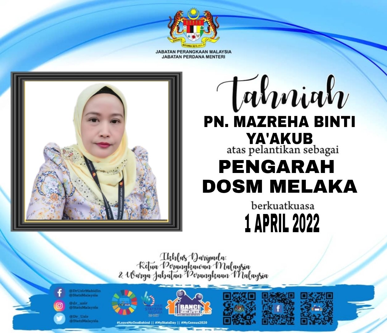 Dr Uzir On Twitter Tahniah Kepada Pn Mazreha Binti Ya Akub Atas Pelantikan Sebagai Pengarah Jabatan Perangkaan Malaysia Negeri Melaka Semoga Dapat Memberikan Perkhidmatan Yang Terbaik Dan Meningkatkan Perkhidmatan Statistik Ke Peringkat Yang